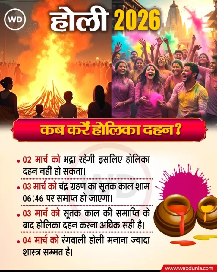 अस्वीकरण (Disclaimer) : चिकित्सा, स्वास्थ्य संबंधी नुस्खे, योग, धर्म, ज्योतिष, इतिहास, पुराण आदि विषयों पर वेबदुनिया में प्रकाशित/प्रसारित वीडियो, आलेख एवं समाचार सिर्फ आपकी जानकारी के लिए हैं, जो विभिन्न सोर्स से लिए जाते हैं। इनसे संबंधित सत्यता की पुष्टि वेबदुनिया नहीं करता है। सेहत या ज्योतिष संबंधी किसी भी प्रयोग से पहले विशेषज्ञ की सलाह जरूर लें। इस कंटेंट को जनरुचि को ध्यान में रखकर यहां प्रस्तुत किया गया है जिसका कोई भी वैज्ञानिक प्रमाण नहीं है।ALSO READ: Happy Holi Wishes 2026: रंगों के त्योहार होली पर अपनों को भेजें ये 10 सबसे मंगलकारी शुभकामनाएं