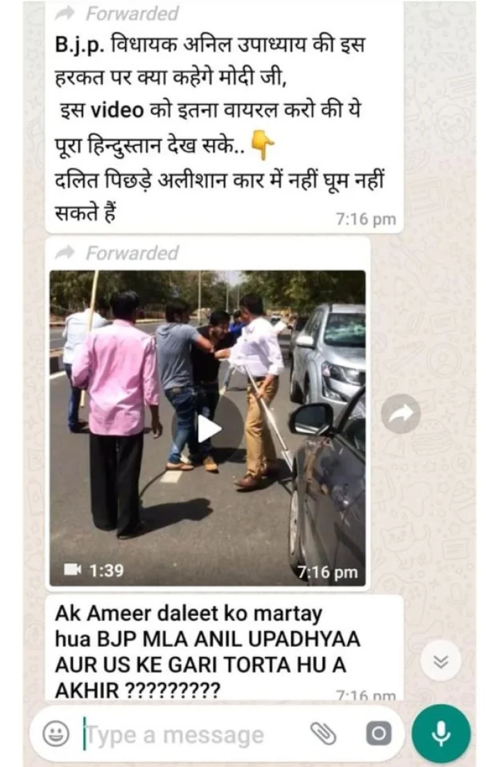 करीब डेढ मिनट के इस वीडियो के साथ हमें जो मैसेज मिले हैं, उनमें लिखा है कि “बीजेपी विधायक अनिल उपाध्याय की इस हरकत पर क्या कहेंगे पीएम मोदी। दलित, पिछड़े आलीशान कार में भी नहीं घूम सकते हैं?”
