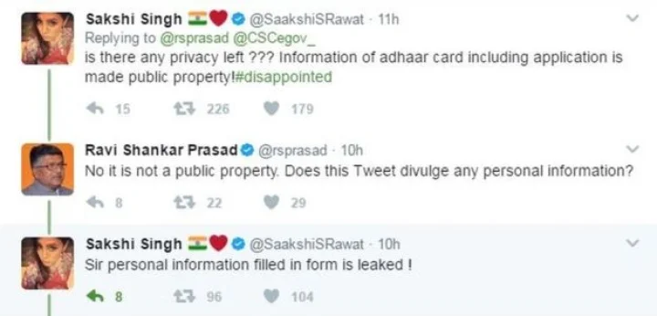 साक्षी ने इसके जवाब में लिखा, ''सर, जिस फॉर्म में पर्सनल जानकारी भरी हुई थी, वो लीक हो गया है।'' एक दूसरे ट्वीट में साक्षी ने एक तस्वीर के साथ बताया, ''सर मैं @CSCegov_ हैंडल से ट्वीट की इस तस्वीर के बारे में बात कर रही हूं।''