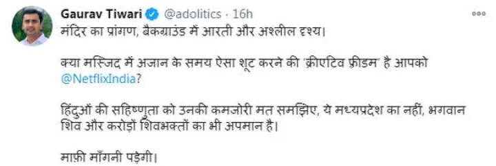 एक ट्वीट में उन्होंने लिखा, मंदिर का प्रांगण, बैकग्राउंड में आरती और अश्लील दृश्य। क्या मस्जिद में अजान के समय ऐसा शूट करने की क्रीएटिव फ़्रीडम है आपको नेटफ्लिक्स इंडिया? हिंदुओं की सहिष्णुता को उनकी कमजोरी मत समझिए, ये मध्यप्रदेश का नहीं, भगवान शिव और करोड़ों शिवभक्तों का भी अपमान है। माफी मांगनी पड़ेगी।