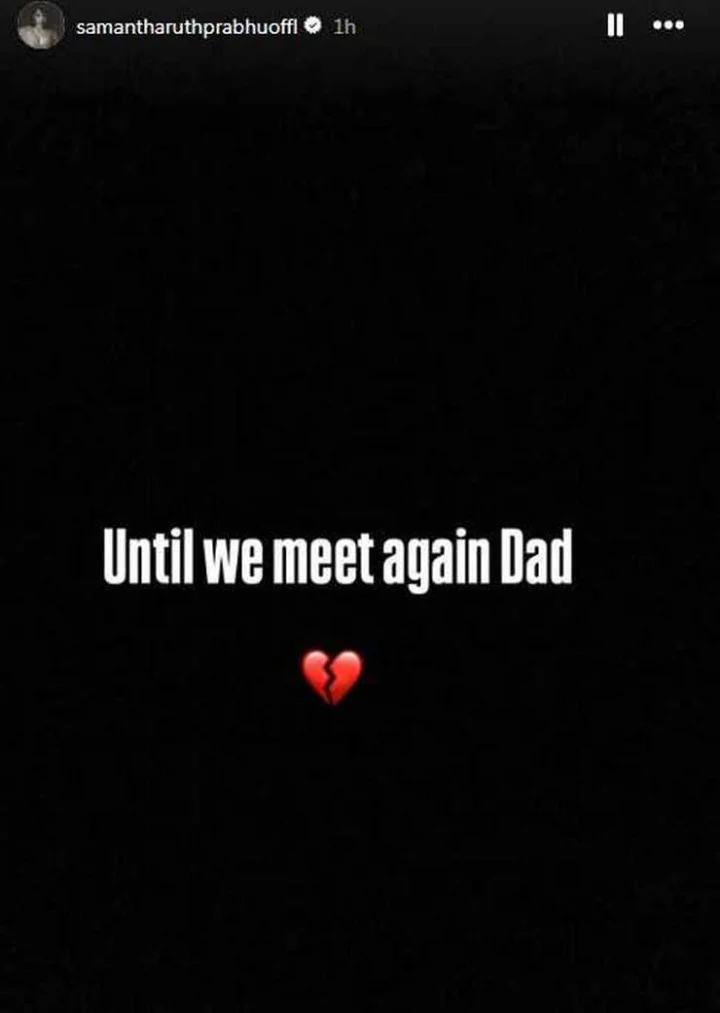 उन्होंने इंस्टाग्राम स्टोरी पर लिखा, 'अब जब तक हम फिर से नहीं मिलते डैड।' इसके साथ उन्होंने टूटे हुए दिल का इमोजी लगाया। समांथा अपने पिता के काफी करीब थीं। उनके पिता उनके सपोर्ट सिस्टम थे।