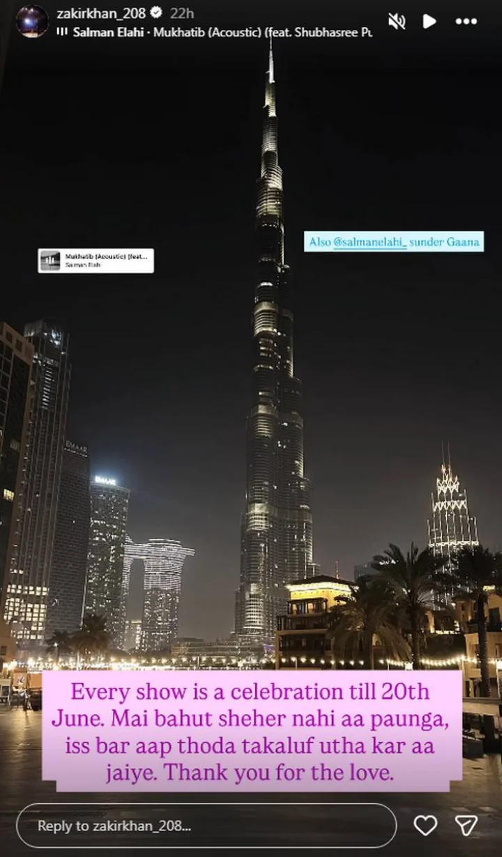 इसके बाद जाकिर खान ने अपनी इंस्टा स्टोरी पर एक पोस्ट शेयर कर इस ब्रेक का हिंट भी दिया। उन्होंने लिखा, '20 जून तक हर शो एक त्योहार है। इस बार मैं कई शहरों में नहीं आ पाऊंगा। इसलिए कृपया थोड़ा एक्स्ट्रा प्रयास करें और शो में आएं। सारे प्यार के लिए धन्यवाद।'