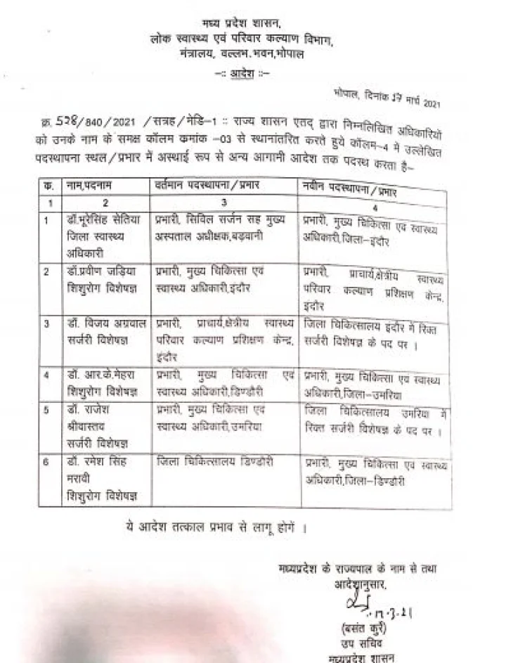 इंदौर। बढ़ते कोरोना के मामलों के बीच डॉ. भूरे सिहं सेतिया को मुख्य चिकित्सा एवं स्वास्थ्य अधिकारी बनाया गया है। कलेक्टर मनीष सिंह ने कहा कि 17 मार्च से रात 10 से सुबह 6 बजे तक के लिए आगामी आदेश तक प्रतिबंधात्मक आदेश जारी किए हैं। यह कर्फ्यू नहीं है। सिंह ने कहा कि इस दौरान दवा, किराना दुकान, दूध डेयरी आदि अति आवश्यक सामग्री की दुकानें खुली रह सकेंगी। बहुत आवश्यक होने पर ही मूवमेंट किया जा सकता है।