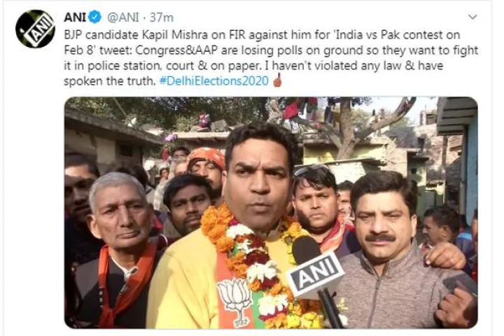 नई दिल्ली। भाजपा नेता और माडल टाऊन से पार्टी प्रत्याशी कपिल मिश्रा को शाहिन बाग को 'मिनी पाकिस्तान' और '8 फरवरी को भारत और पाकिस्तान के बीच मुकाबले' संबंधी ट्वीट खासा महंगा पड़ गया। उनके खिलाफ मॉडल टाउन थाने में मुकदमा भी दर्ज हो गया।