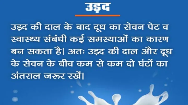 2 उड़द - उड़द की दाल के बाद दूध का सेवन पेट व स्वास्थ्य संबंधी कई समस्याओं का कारण बन सकता है। अत: उड़द की दाल और दूध के सेवन के बीच कम से कम दो घंटों का अंतराल जरूर रखें।