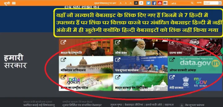 6. हिन्दी वेबसाइट पर "हमारी सरकार" विकल्प के तहत अन्य नौ सरकारी वेबसाइटों को लिंक किया गया है उसमें संबंधित हिन्दी वेबसाइटों को लिंक किया जाना चाहिए ताकि वेबसाइट नाम पर क्लिक करने पर संबंधित हिन्दी वेबसाइट खुल जाए।