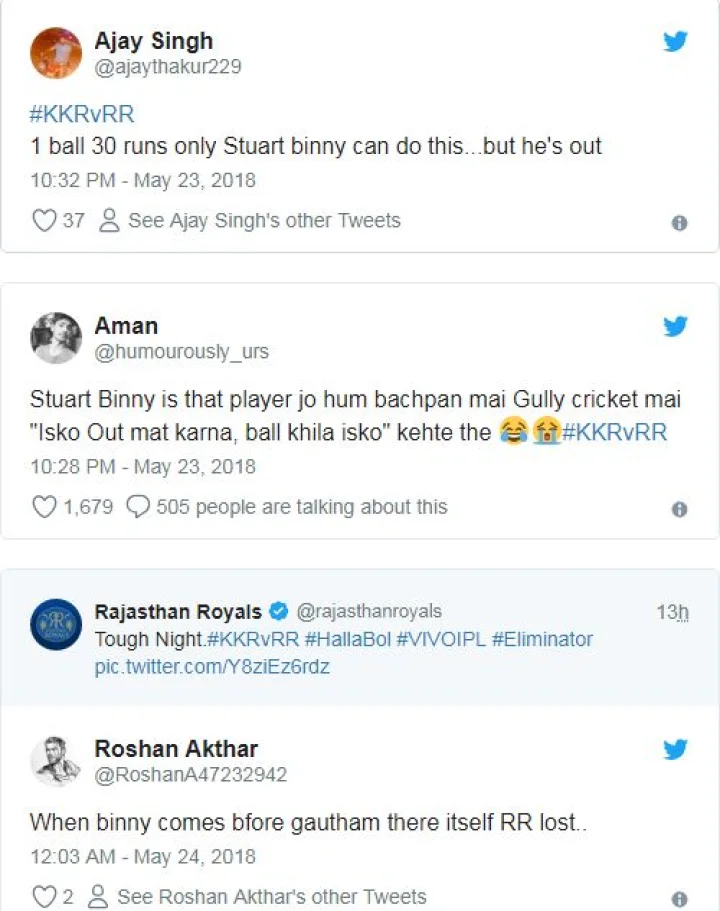 इस निराशाजनक प्रदर्शन के बाद राजस्थान रॉयल्स के फैंस ने सोशल मीडिया पर स्टुअर्ट बिन्नी का जमकर मजाक उड़ाया। नीचे पढ़िए बिन्नी पर कसे गए कुछ ट्विटर तंज।