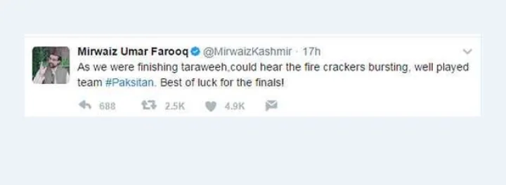 मीरवाइज ने बुधवार को आईसीसी चैंपियन ट्रॉफी में पाकिस्तान की इंग्लैंड के खिलाफ जीत पर ट्वीट कर खुशी का इजहार कर पाकिस्तानी खिलाड़ियों के प्रदर्शन की तारीफ की थी। मैच में पाकिस्तान की जीत पर उन्होंने कहा कि पटाखों के फूटने की आवाज सुनी जा सकती है, पाकिस्तान की टीम बहुत अच्छा खेली, फाइनल के लिए शुभकामनाएं।