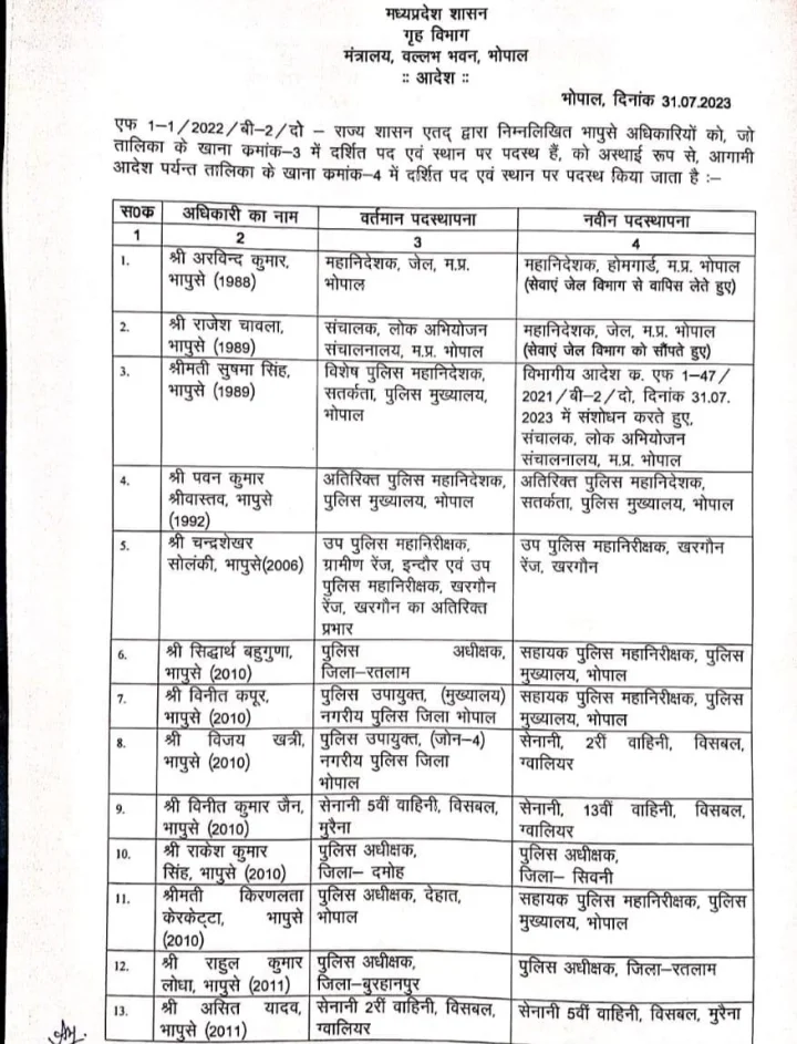 मध्यप्रदेश में 34 IPS अफसरों के तबादले, 10 जिलो के एसपी बदले