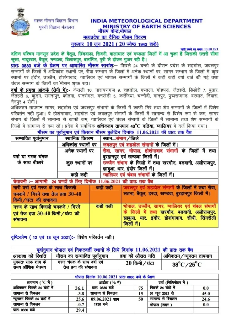 मौसम विभाग ने मानसून के आने के साथ-साथ प्रदेश के जबलपुर और शहडोल संभाग के जिलों के साथ रीवा,सतना,बैतूल,हरदा,खंडवा और बुराहनपुर में भारी बारिश को लेकर ऑरेंज अलर्ट जारी किया है। इसके साथ ही भोपाल,उज्जैन,सागर,ग्वालियर और चंबल संभाग के जिलों में बारिश का येलो अलर्ट जारी किया गया है। इसके साथ खरगौन, बड़वानी, अलीराजपुर, झाबुआ, धार, इंदौर, होशंगाबाद, सीधी और सिंगरौली में बारिश का यलो अलर्ट जारी किया है।