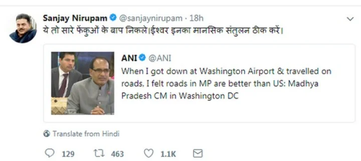 उल्लेखनीय है कि शिवराज ने निवेशकों से बातचीत के दौरान कहा कि जब मैंने वॉशिंगटन एयरपोर्ट से बाहर निकलकर सड़क पर सफर किया तो मुझे लगा कि इससे अच्छी सड़कें तो मध्यप्रदेश की हैं। संजय निरुपम ने ट्वीट कर कहा कि ये तो सारे फेंकुओं के बाप निकले। ईश्वर इनका मानसिक संतुलन ठीक करें।