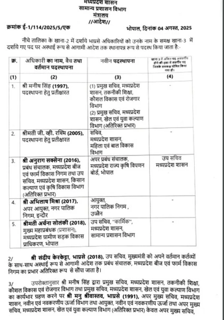 मनीष सिंह बने प्रमुख सचिव, 70 अपर कलेक्टर और 107 राज्य प्रशासनिक सेवा अधिकारियों के ट्रांसफर