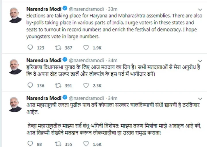 - प्रधानमंत्री नरेन्द्र मोदी ने ट्वीट कर जनता से मतदान की अपील की।