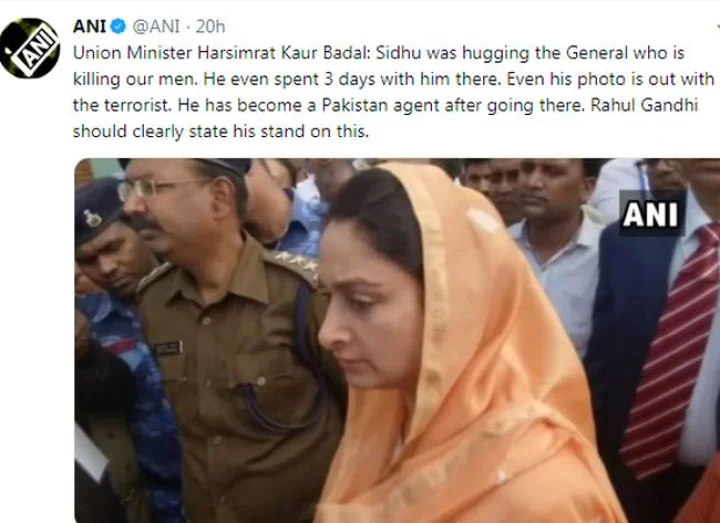 सिद्धू पर निशाना साधते हुए अकाली नेता ने कहा कि सिद्धू ने उस पाकिस्तानी सेना प्रमुख को गले लगाया, जिन्होंने हमारे सैनिकों को मारा है। सिद्धू ने पाकिस्तान में उनके साथ तीन दिन बिताए हैं। यहां तक कि आतंकवादी (गोपाल चावला) के साथ उनका फोटो भी सामने आया है।