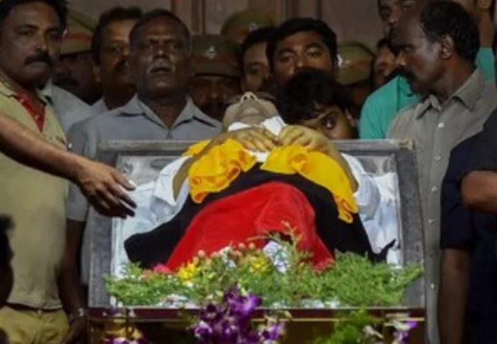 लोगों ने काली कमीज पहनकर जताया शोक : करुणानिधि की अंतिम यात्रा में शामिल सैकड़ों लोगों ने काली कमीज पहनी हुई थी और वे दिवंगत नेता की तस्वीरें और तख्तियों थामे हुए थे। करुणानिधि के पार्थिव शरीर को राष्ट्रीय ध्वज में लपेटा गया था। उन्हें काला चश्मा, पीली शॉल, सफेद कमीज और धोती पहनाई गई।
