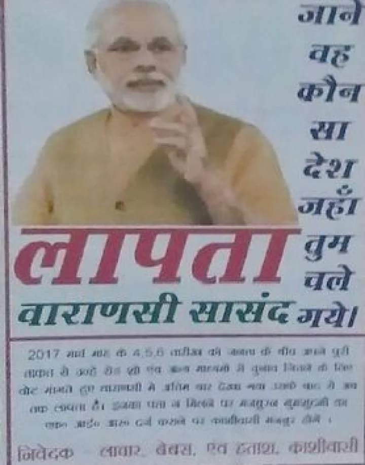 पोस्टर वाराणसी के प्रमुख स्थानों पर चिपकाए गए हैं। सबसे ऊपर नरेन्द्र मोदी का फोटो लगा हुआ है। उसके नीचे बड़े अक्षरों में लापता वाराणसी सांसद लिखा हुआ है। इसके साथ ही 'जाने वो कौनसा देश जहां तुम चले गए...' भी लिखा हुआ है। पोस्टर में इसका उल्लेख नहीं है कि यह किसने लगाया है, लेकिन निवेदक के सामने लाचार, बेबस एवं हताश काशीवासी लिखा हुआ है।