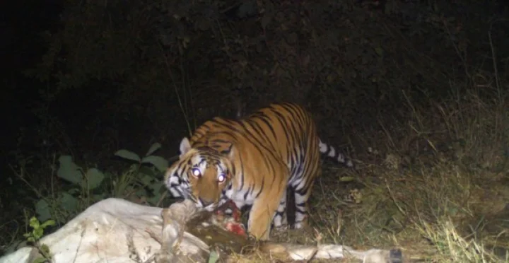 इस सर्चिंग के दौरान विभाग द्वारा बाघ को पकड़ने के लिए पिंजरा लगाया था। बाघ की सही स्थिति का पता लगाने के लिए वन विभाग ने गाय के शिकार वाली जगह मंगलवार को ट्रेप कैमरा लगाया था। इस कैमरे में बाघ के शिकार की तस्वीरें कैद हुई हैं।