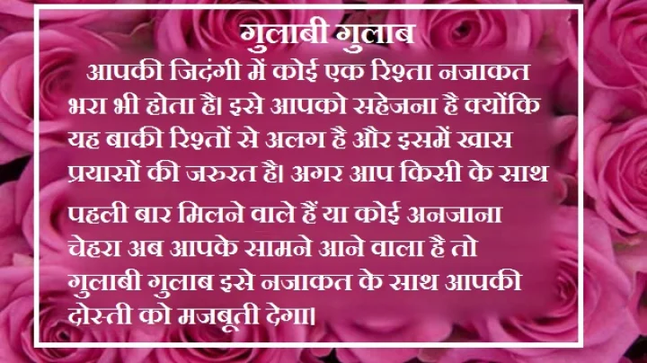 लाइफ बहुत लंबी नही है और प्यार की कोई उम्र नहीं होती। अपने हिसाब से रिश्तों की गरिमा को बनाए रखते हुए अपना गुलाब चुनिए और अपने शब्द भी क्योंकि शायद सिर्फ गुलाब आपकी बात पूरी न कर पाए। समय और मौका आ चुका है जब आप वह कह दें जो पहले नहीं कहा क्योंकि अब आपके पास गुलाब का साथ है।