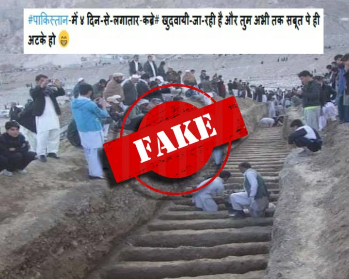 ‘पाकिस्तान में 4 दिन से लगातार कब्रे खुदवायी जा रही है और तुम अभी तक सबूत पे ही अटके हो’ – इस कैप्शन के साथ यह तस्वीर शेयर की जा रही है।